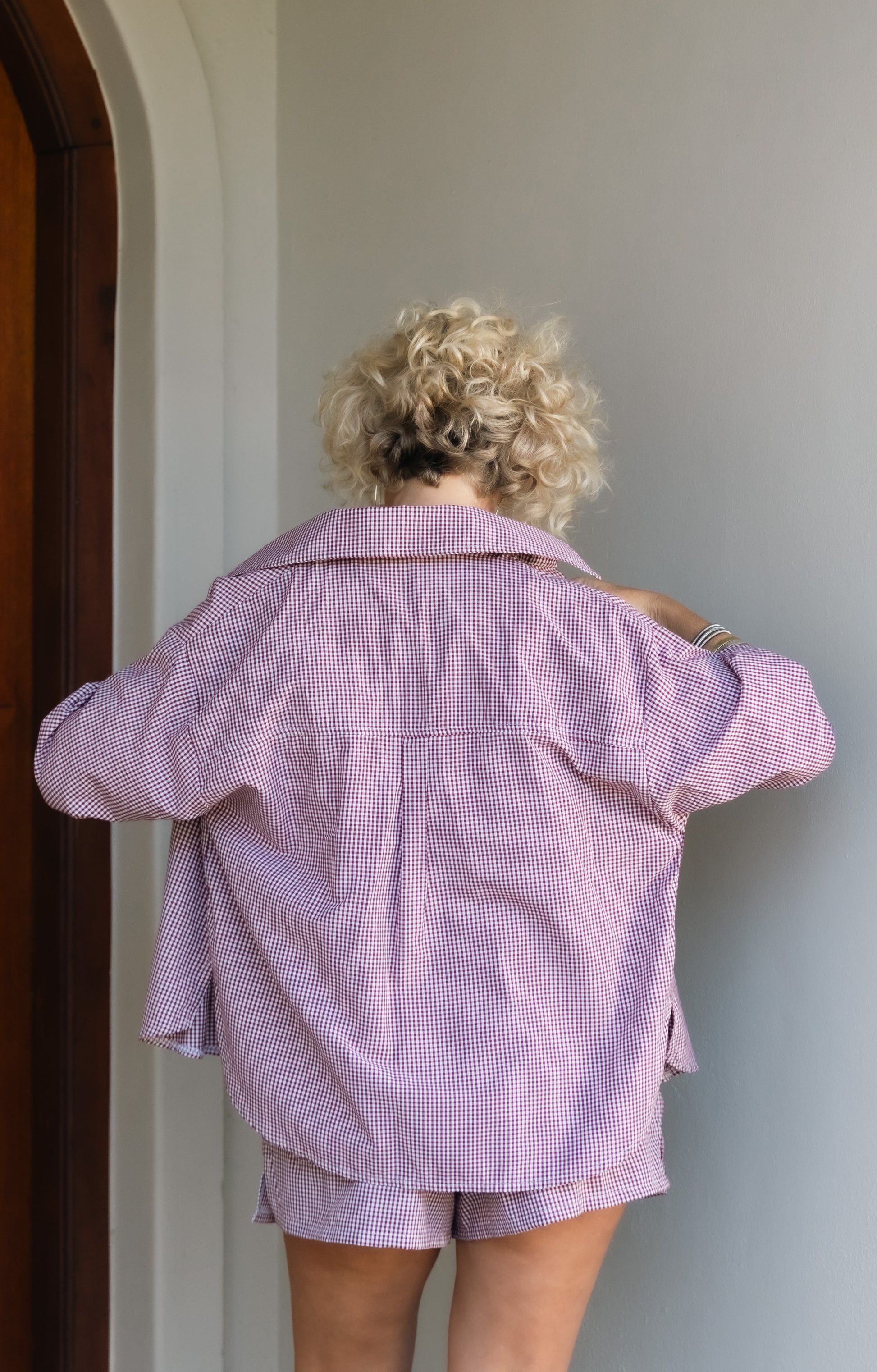 The Checkmate Shirt is a modern twist on a classic button-up. Crafted from soft checkered cotton in olive or burgundy tones, this boxy shirt features a hidden button stand for a clean, streamlined look. Its curved hemline with side slits adds movement and a relaxed vibe, while the elbow-length sleeves finished with wide hems bring a contemporary, effortless touch.